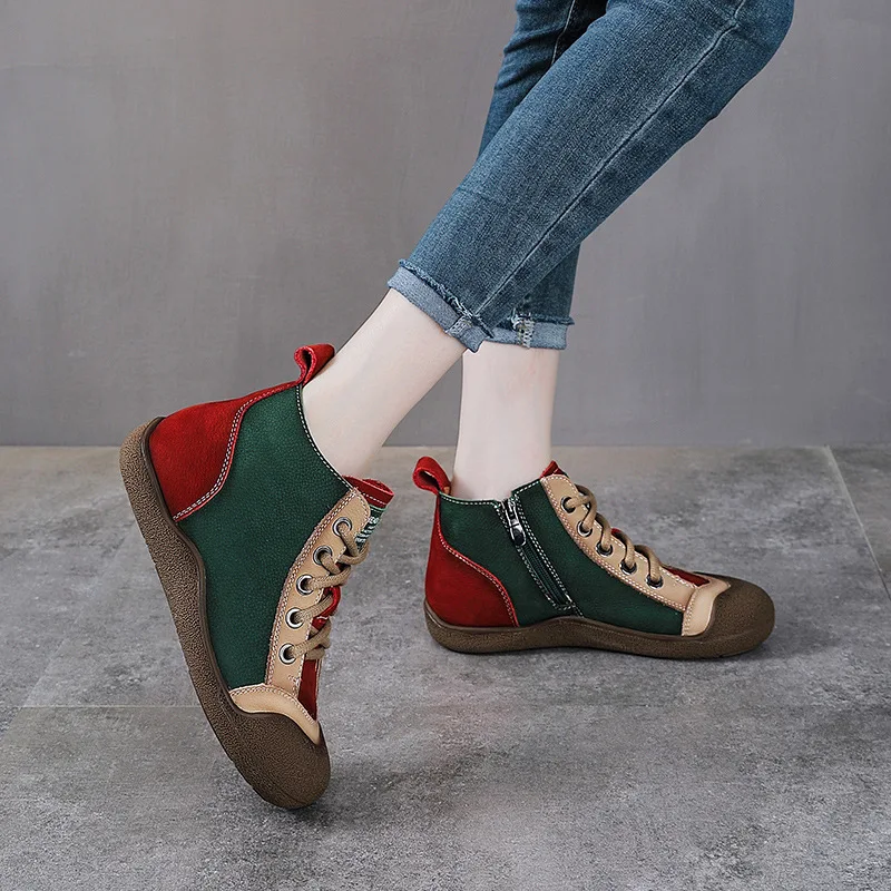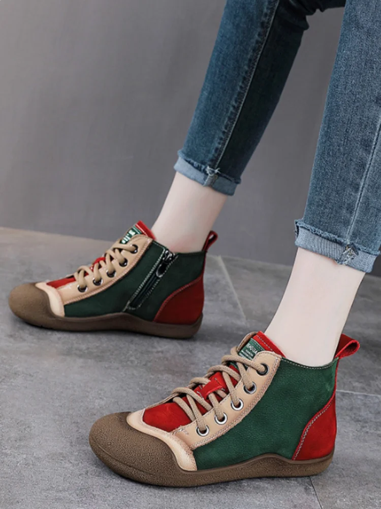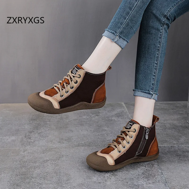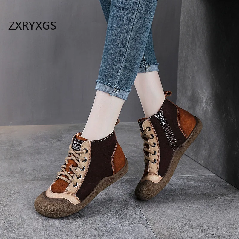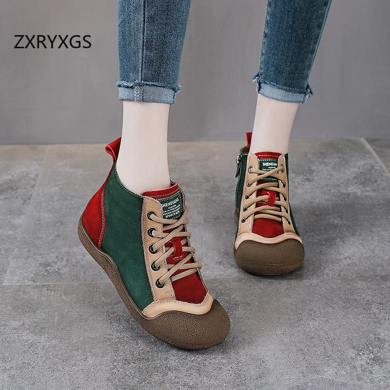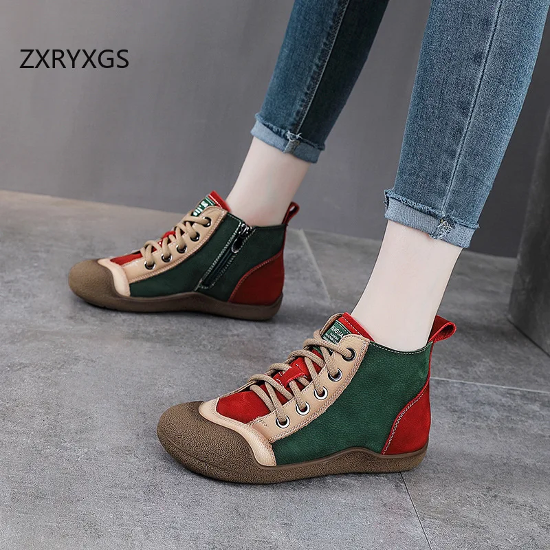 ZXRYXGS 2025 Top Layer Cowhide Spell Colors Splicing Women’s Trendy Sneakers Flat Shoes Ankle Boots Fashion Casual Sneakers Tide